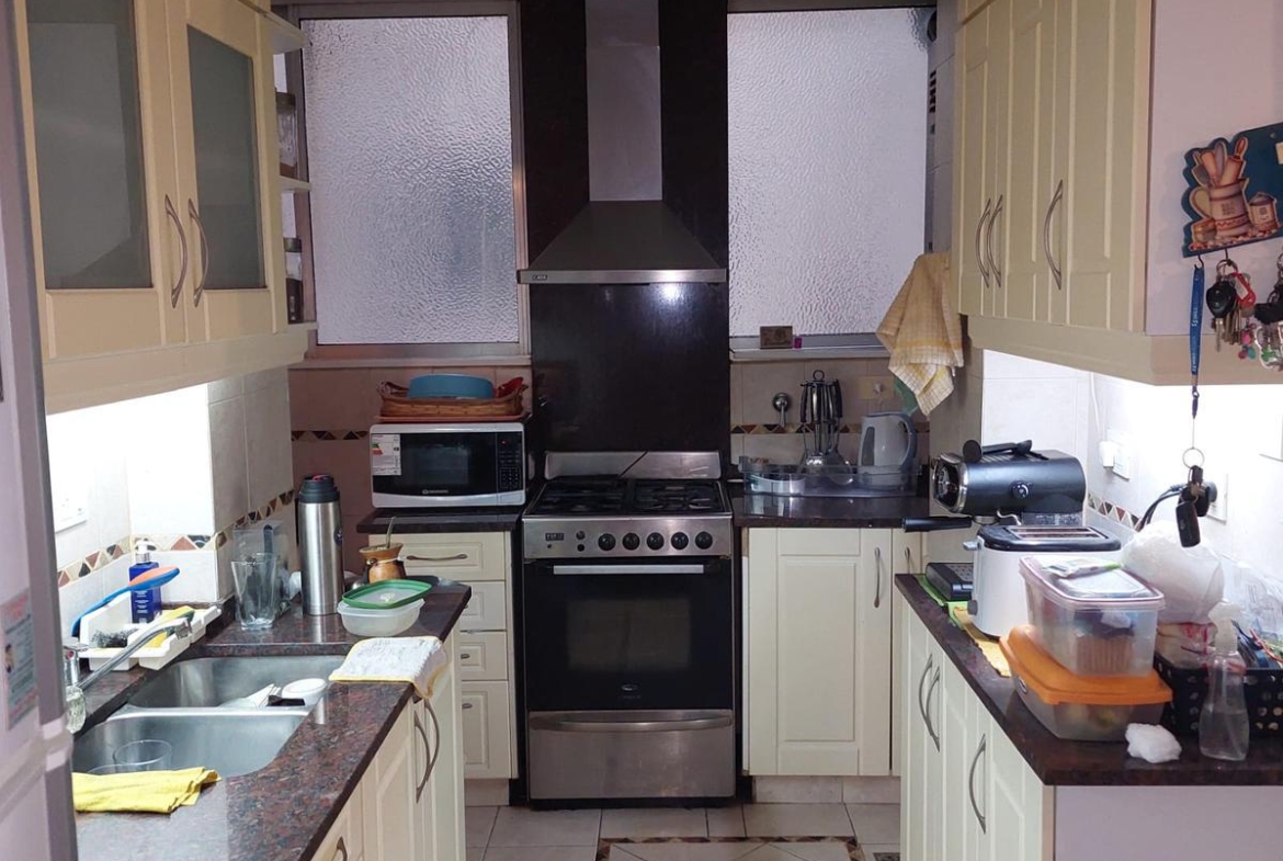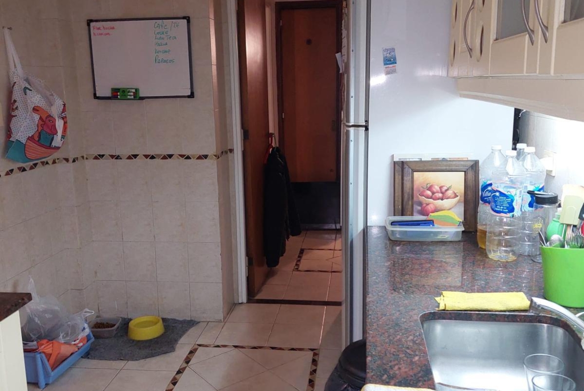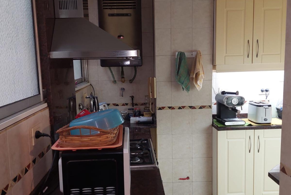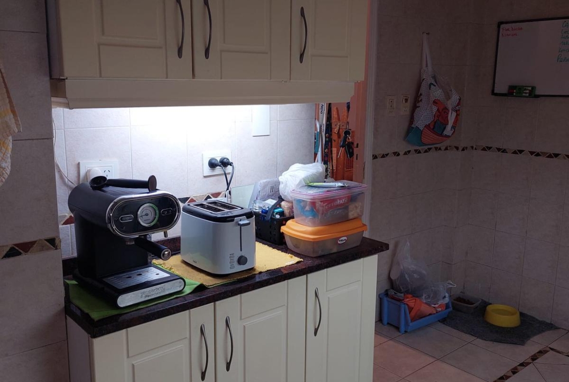 Cocina, pisos cerámicos, muebles bajo mesada y alacena