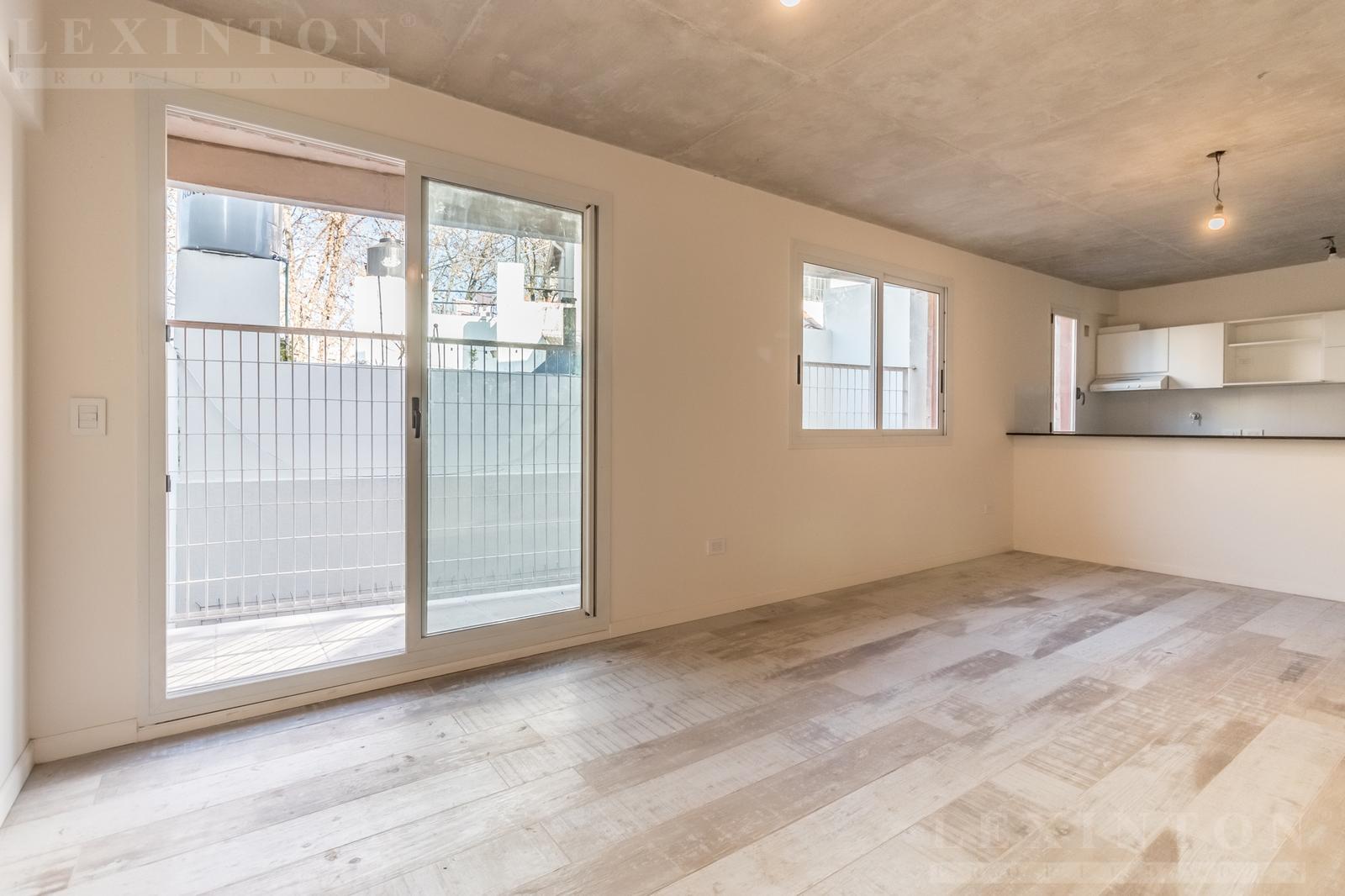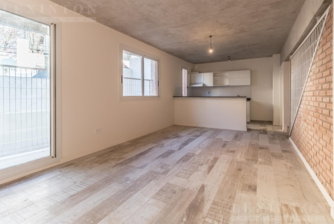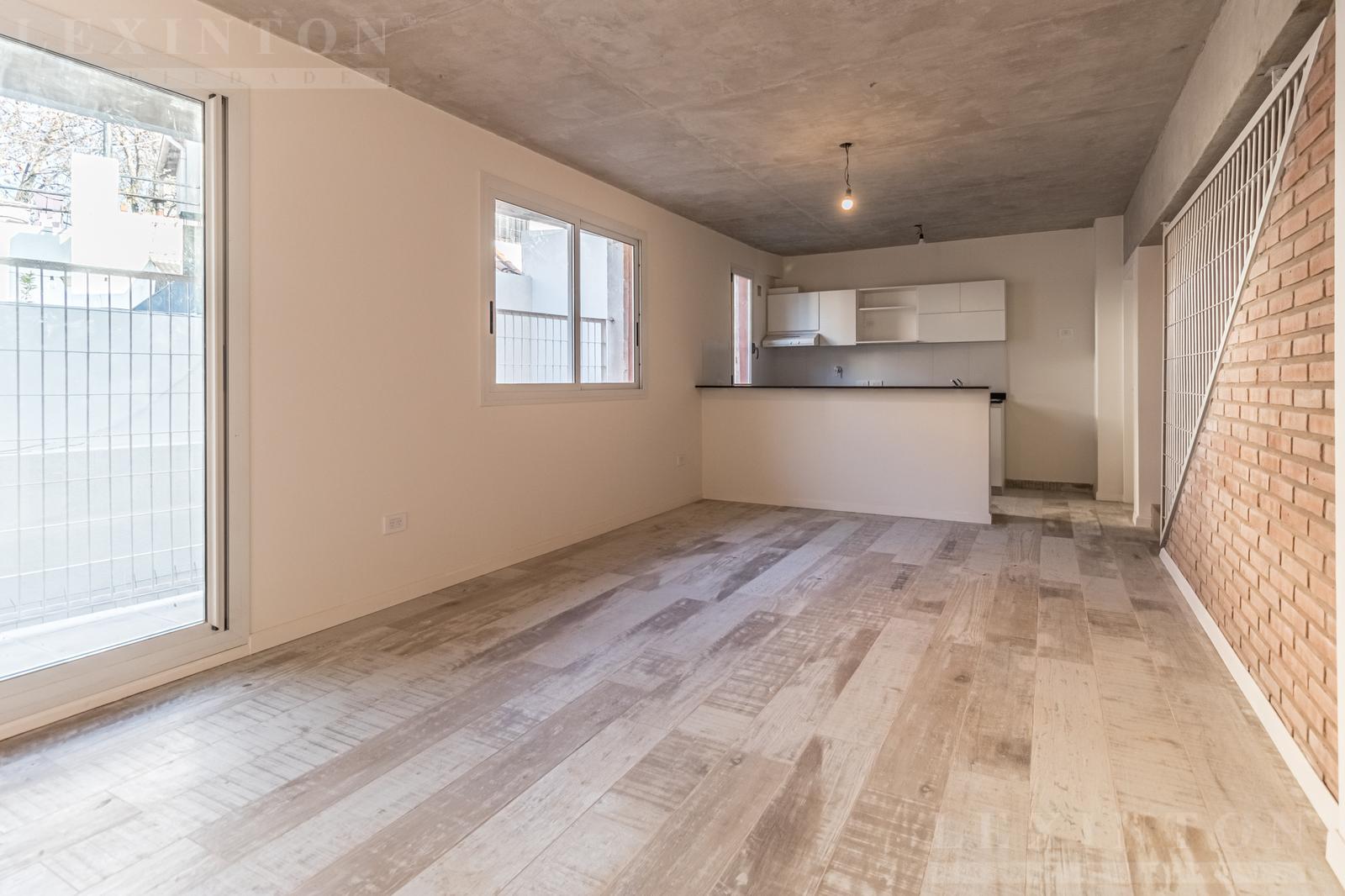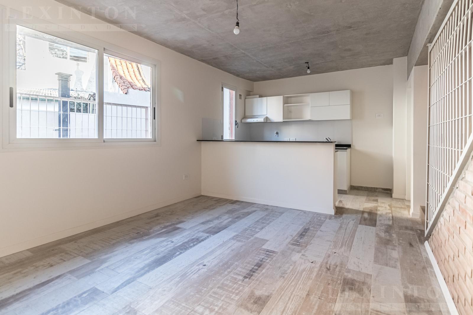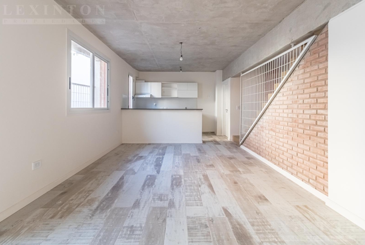 En primer piso por escalera, Living comedor con pisos cerámicos símil madera, cocina integrada