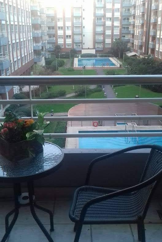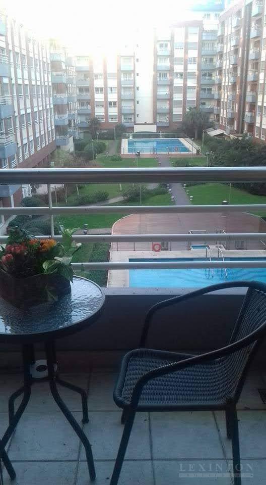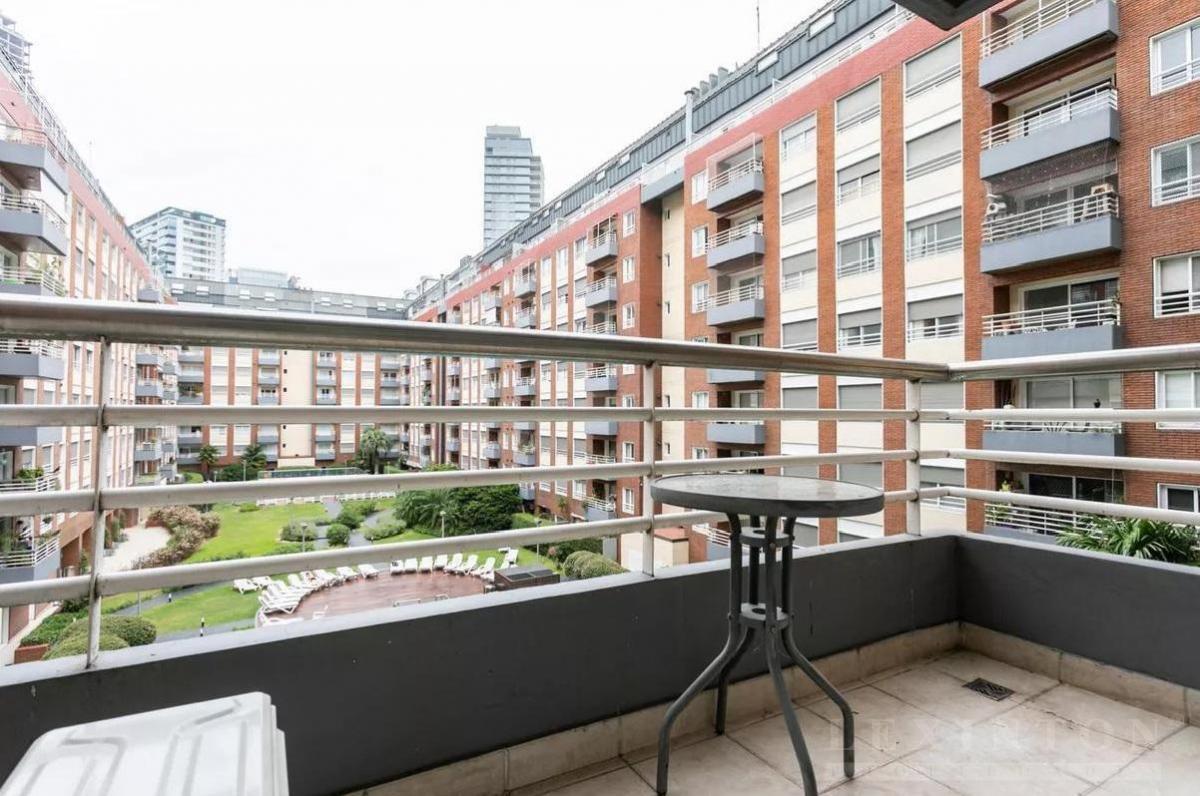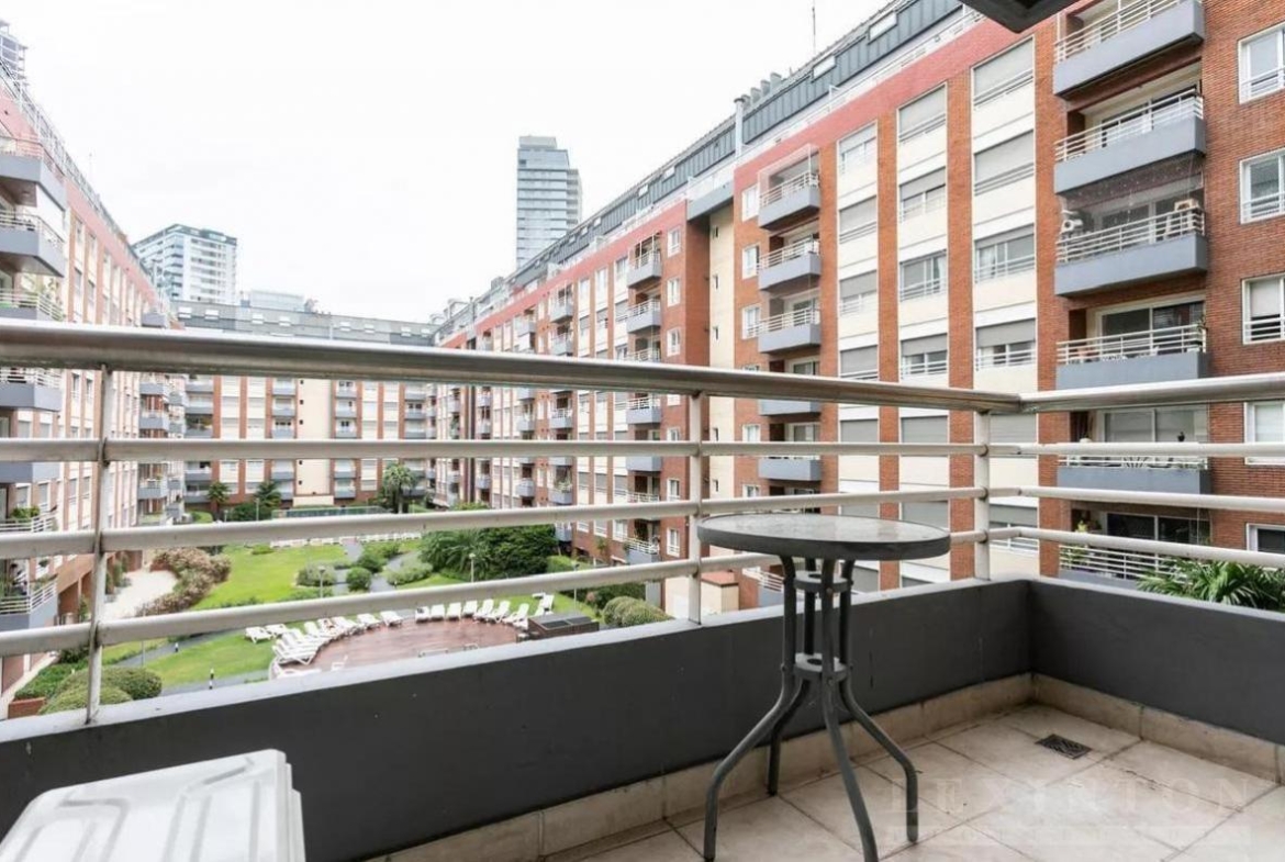 Cómodo balcón con vista al jardín central del edificio y a la pileta climatizada, aportando luminosidad y sensación de
