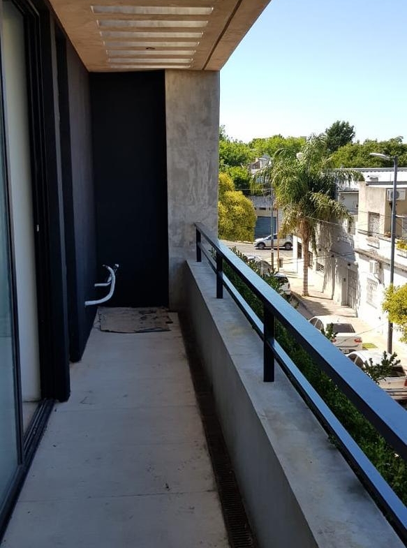 Living Comedor pisos de porcelanato, techo de cemento a la vista con salida al balcón
