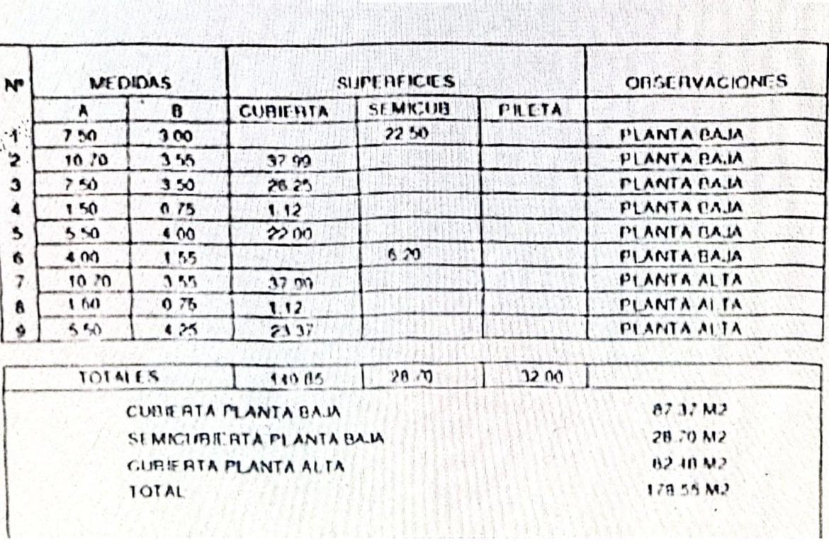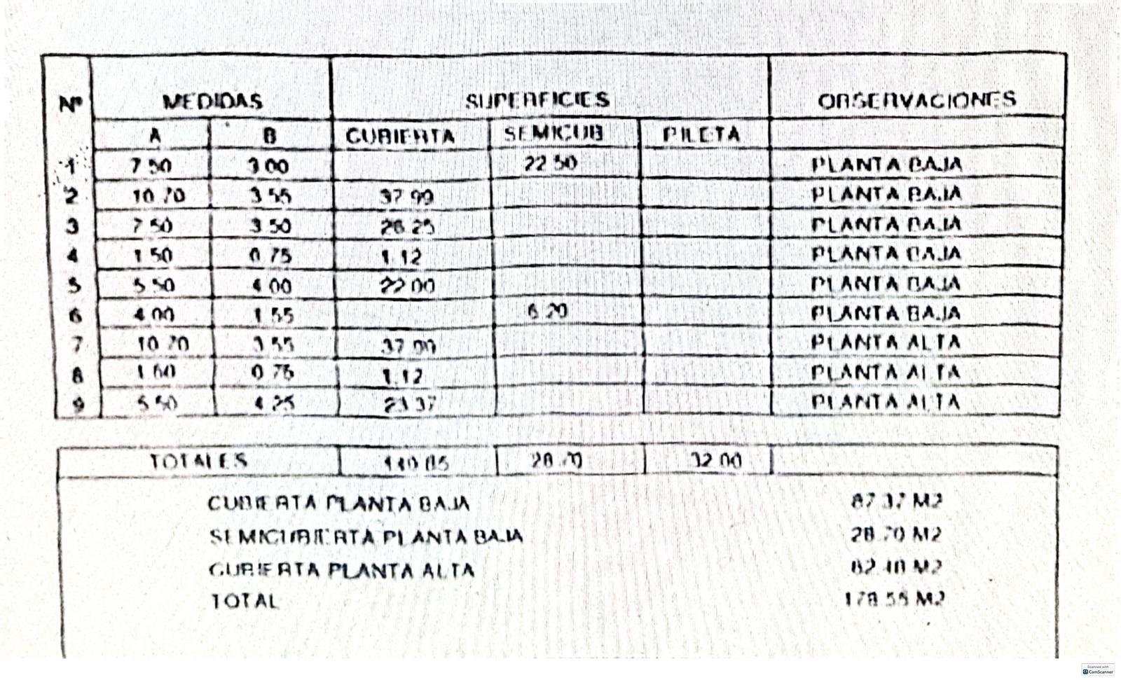 Sup cub: 149,85 m2 – Semi: 28,70 m2- Descubiertos: 677,45 m2. Total: 178, 55 m2.Desarrollada en dos plantas.